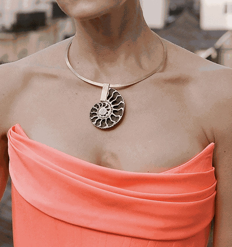 Putting a face to the jewellery, Francesca Grima wears contemporary and vintage pieces from the collection. Of particular note are an Ammonite necklace with matching earrings and a pair of Watermelon Tourmaline earrings designed by Francesca; a Green Tourmaline necklace and Green Tourmaline “Brick” ring designed by her mother Jojo Grima and a Citrine Geode Necklace and “Elegance” watch designed by her father, Andrew Grima.