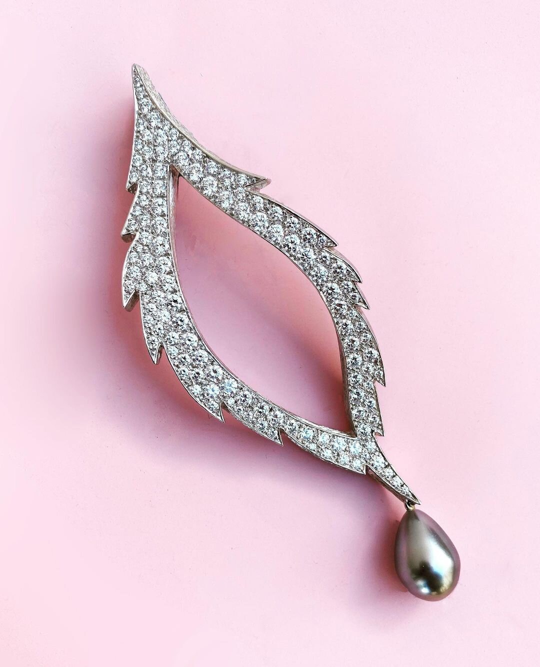 This stunning brooch pendant was made shortly after Andrew Grima moved to Gstaad in Switzerland. The grey Tahiti drop pearl is detachable allowing the stylised white gold and diamond set “leaf” to be worn on it’s own as a brooch or with the pearl attached on a white gold collar as a pendant.
