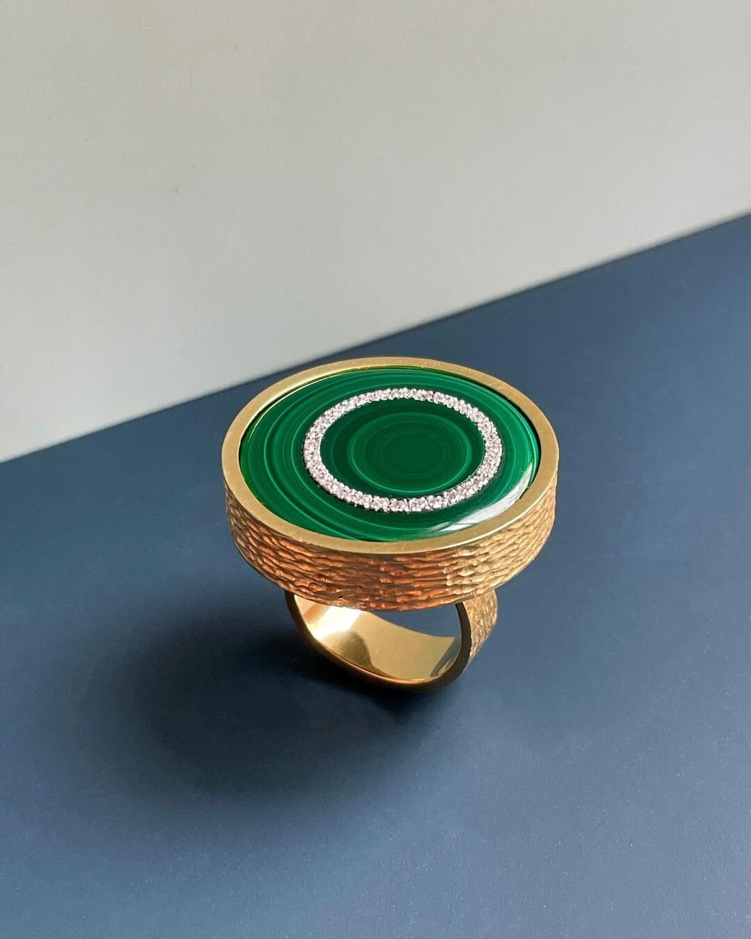 The rugged, textured yellow gold mount, polished malachite disk and circumference of diamonds conjures a ring commissioned by an ancient order of astronomers to plot the orbit of a star in a distant, green banded galaxy…alternatively this was (possibly in a parallel universe) the ring worn by Nile Rodgers as he worked on the lyrics for “He’s the Greatest Dancer”...Grima, Gucci, Fiorucci!