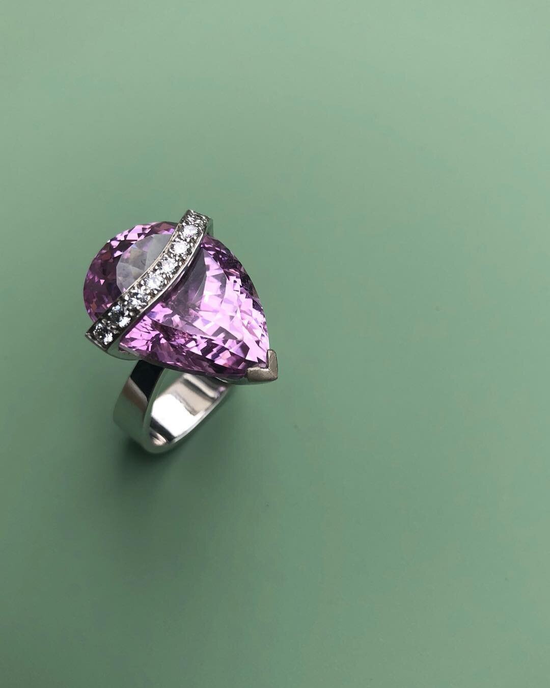 Andrew Grima was renowned for his playful irreverence and refusal to treat a million pound diamond any different from a seashell or pebble. He once bought, on behalf of a wealthy customer, the most expensive diamond ever purchased at auction at the time: a 55 carat D colour, flawless drop. A few weeks later he presented a ring to the customer with a diagonal flash of diamonds set in platinum right across the table of this priceless stone, giving the impression it was covering up an enormous flaw. This 32 carat Kunzite drop with a diagonal band of brilliant cut diamonds set in white gold pays homage to the original.