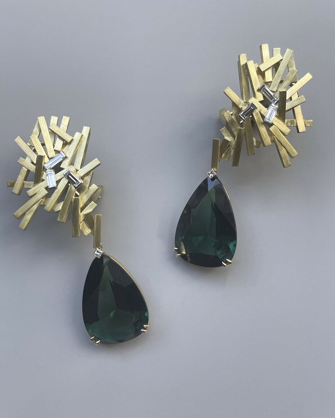 Dress up or down with these gold and diamond earrings with detachable tourmaline drops. The tops of the earrings which at first sight resemble an abandoned game of “Pick-a-stick” are in fact artfully arranged gold batons accented with baguette diamonds which follow and flatter the contour of the ear. The detachable, faceted green tourmaline drops are suspended from a single, square-cut diamond and weigh 27.2 carats.