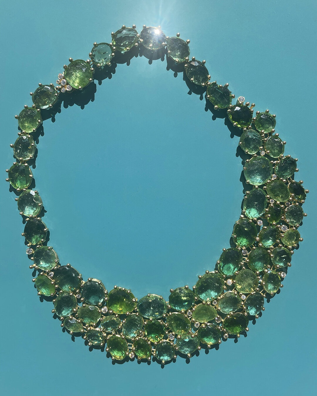 This beautifully crafted necklace comprises 56 faceted green tourmalines, each framed and articulated by polished yellow gold wire allowing the jewel to sit perfectly on the wearer’s neck. The stones are held by bauble-shaped collets and accented by brilliant cut diamonds. The clasp is cleverly hidden behind one of the stones with a thumbpiece set with five diamonds. The overall effect is organic, elegant and sufficiently versatile to be worn with an evening dress or sweater and jeans.