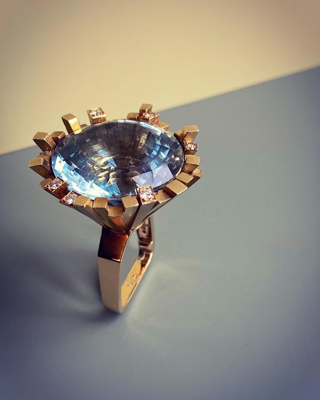 This sculptural, almost architectural masterpiece features a large natural blue topaz mounted in yellow gold rods highlighted by brilliant-cut diamonds. Andrew Grima was a great admirer of the architects Lúcio Costa, Oscar Niemeyer and Roberto Burle Marx who between 1955 and 1960 created the city of Brasilia from scratch. This ring references their modernist style.