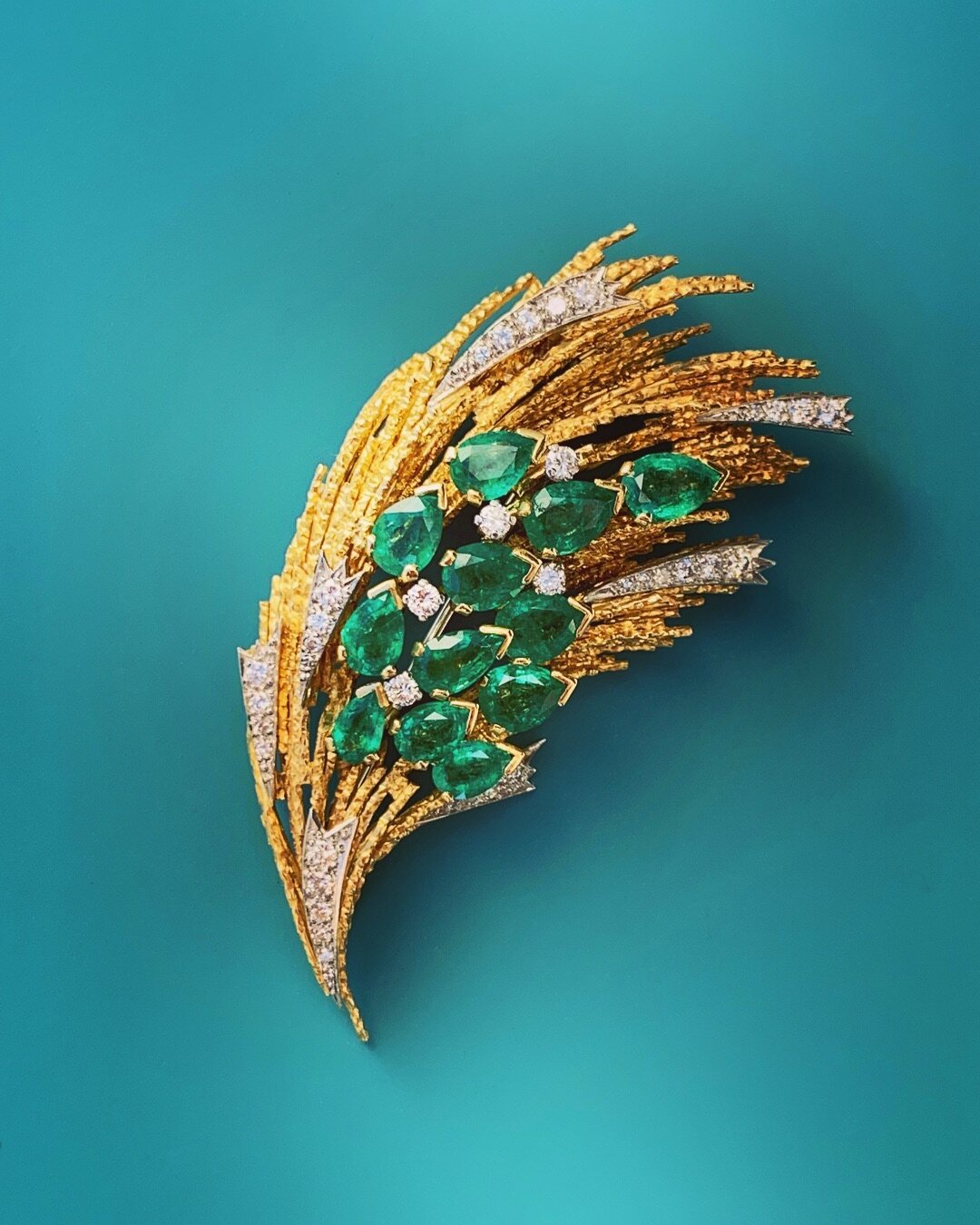 This brooch is one of the best examples of textured gold wire work we have ever come across. Set with 12 pear shaped emeralds, brilliant-cut diamonds set in collets and pavé, it is a wonderfully crafted combination of both intrinsic and artistic value.