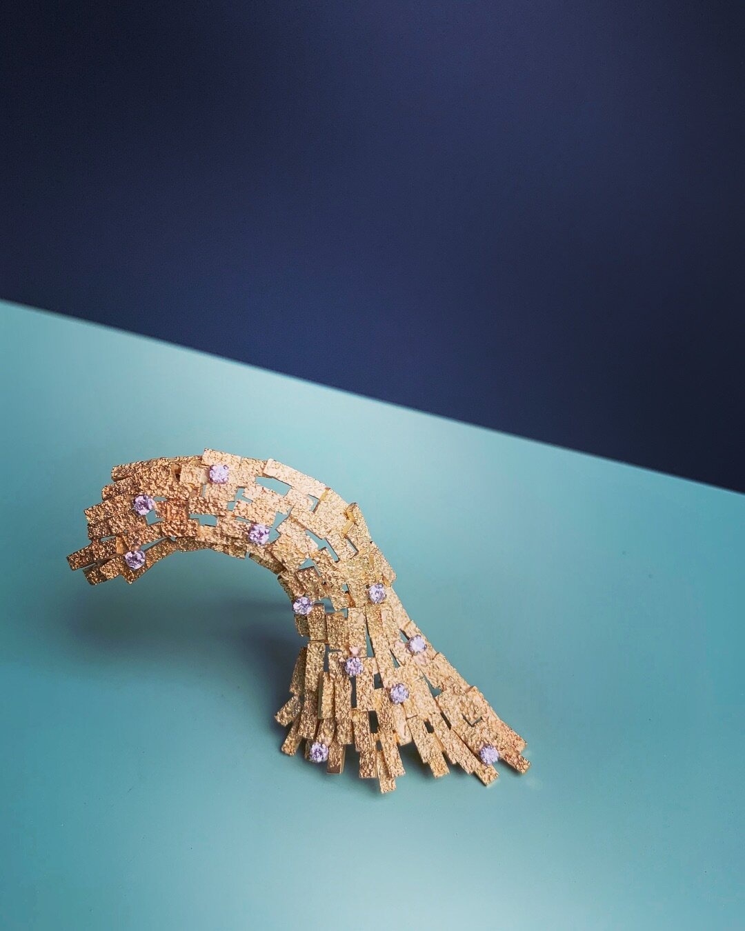 This brooch, a miniature abstract sculpture made of textured yellow gold bricks set with diamonds was designed by Andrew Grima in 1965 and sold to The House of Garrard, royal jewellers since 1735. Had Andrew Grima been a Modern British sculptor instead of a jewellery designer this would surely have been a museum quality work of art.