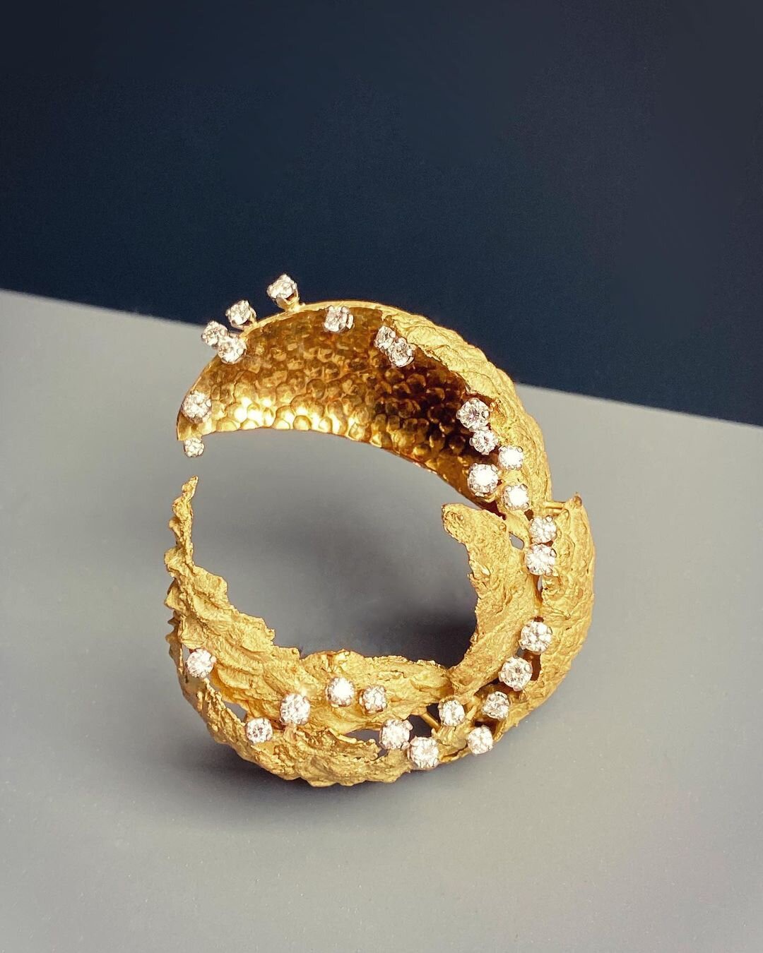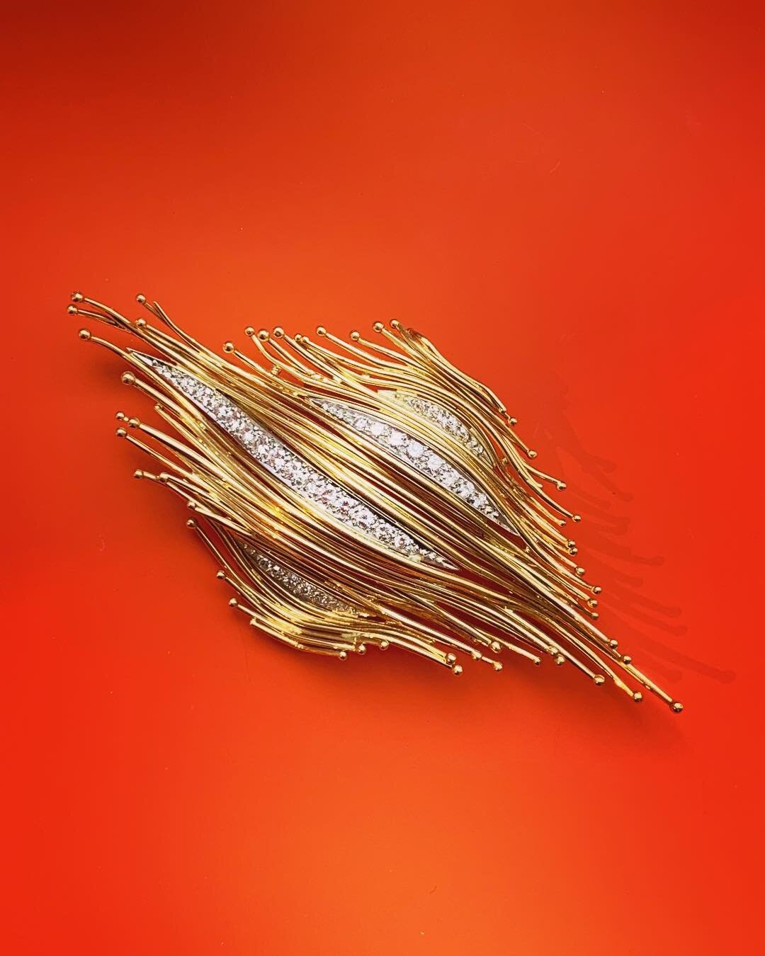 This yellow gold and diamond brooch uses gold wire to mimic reeds rippling in a fast flowing river. The diamonds suggest sunlight reflecting on the surface of the water. It is typical of Andrew Grima’s organic, biomorphic design style inspired by natural forms.